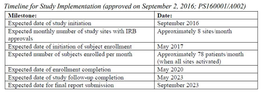 So, by the FDA’s own admission, the study had only three enrolled sites by the time the clinical trials were to begin. According to the FDA page, not only has that enrollment not changed, but there is only one patient enrolled out of the required 2,400. (This data was updated October 2, 2017.)